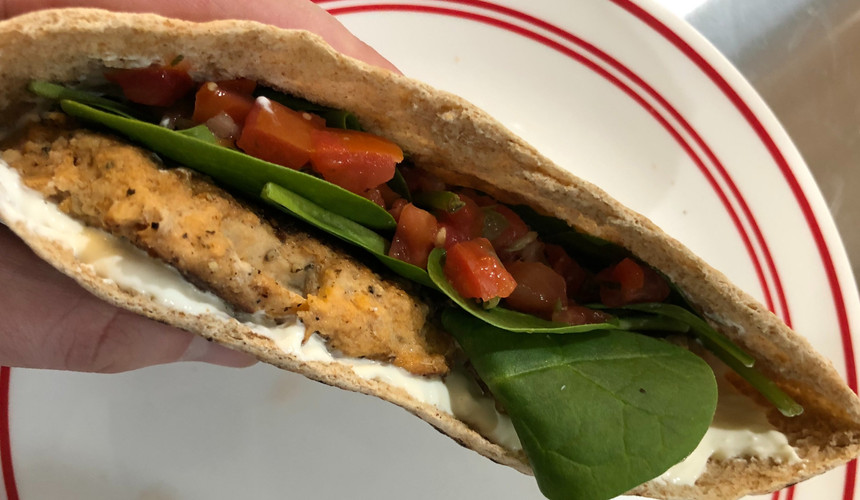 Step 4: Preparation! Halve a whole wheat pita bread, spread 2 tablespoons of lime yogurt sauce on the inside, throw in two chicken burgers, then add spinach and sliced or diced tomato.